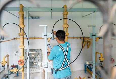 Fig 01. Caption: Drinking water technician of PDAM Tugu Tirta Kota Malang checking the chlorine dose as part of operational monitoring.  Photo Credit: WHO/Rumah Drone Aerial