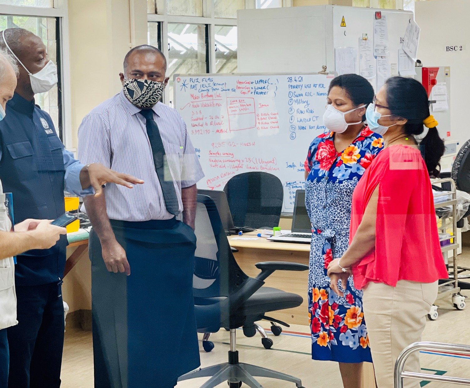 Dr Waqainabete, accompanied by Dr Akeem Ali, Acting Representative of WHO in the South Pacific, Mr. Sheldon Yett, Representative of UNICEF in the Pacific, and Mr. Sunia Soakai, Deputy Director of the Public Health Division of the Pacific Community, also thanked the team of doctors and nurses working tirelessly at the CDC to ensure that testing is done in a timely manner.